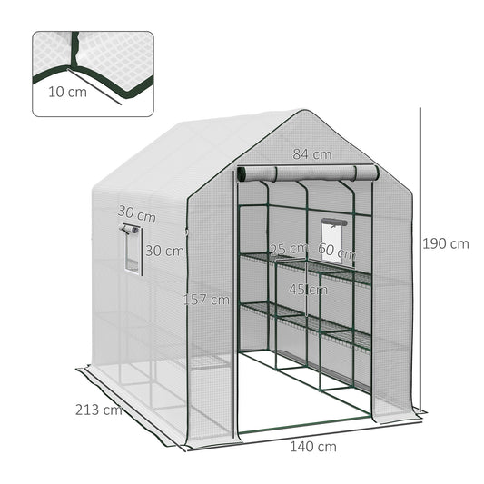 Outsunny Walk-in Greenhouse with 3 Tier Shelves, Green House Garden Grow House with PE Cover, Roll-up Door, Mesh Windows, 140 x 213 x 190cm, White