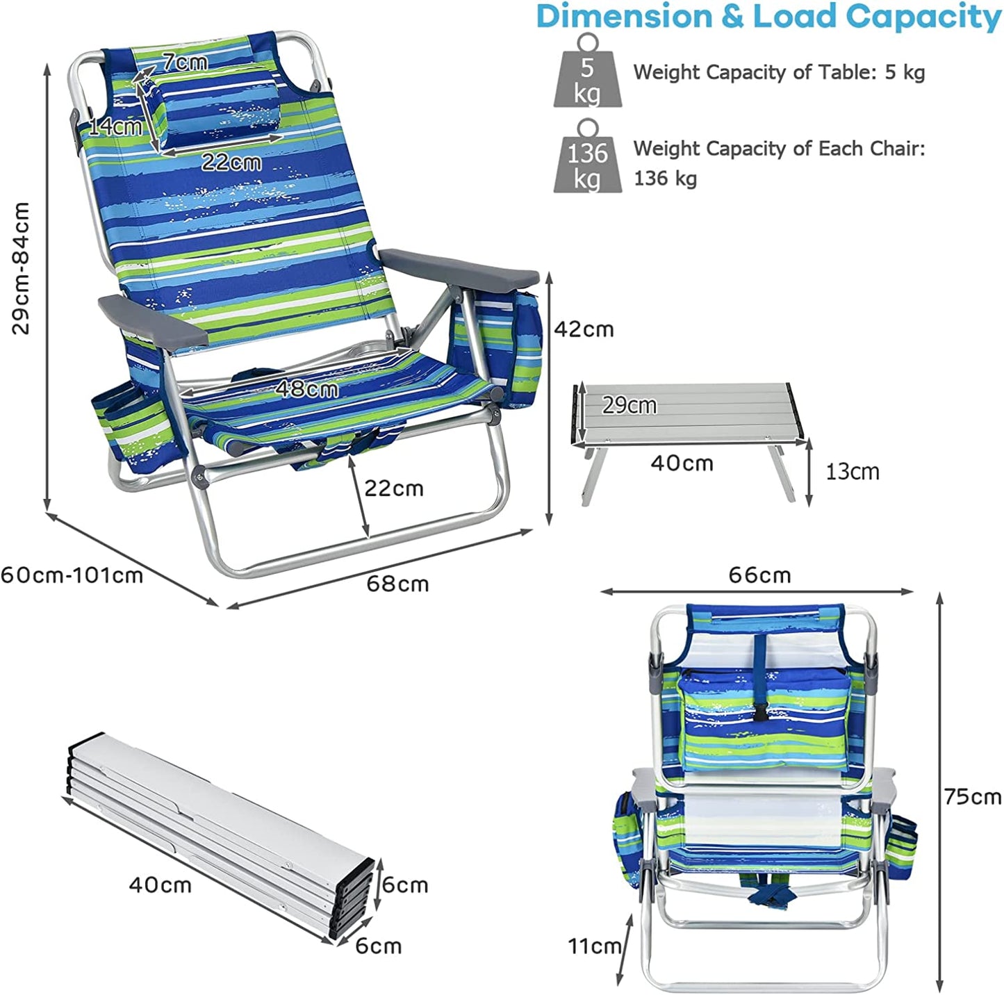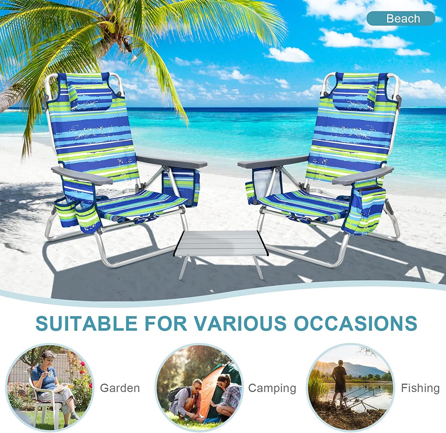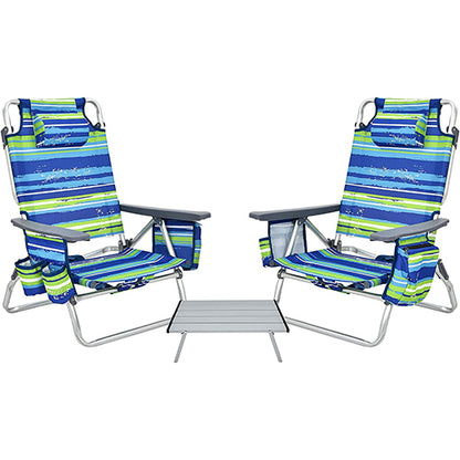 2 Packs 5-Position Outdoor Folding Backpack Beach Table and Reclining Chair Set-Blue