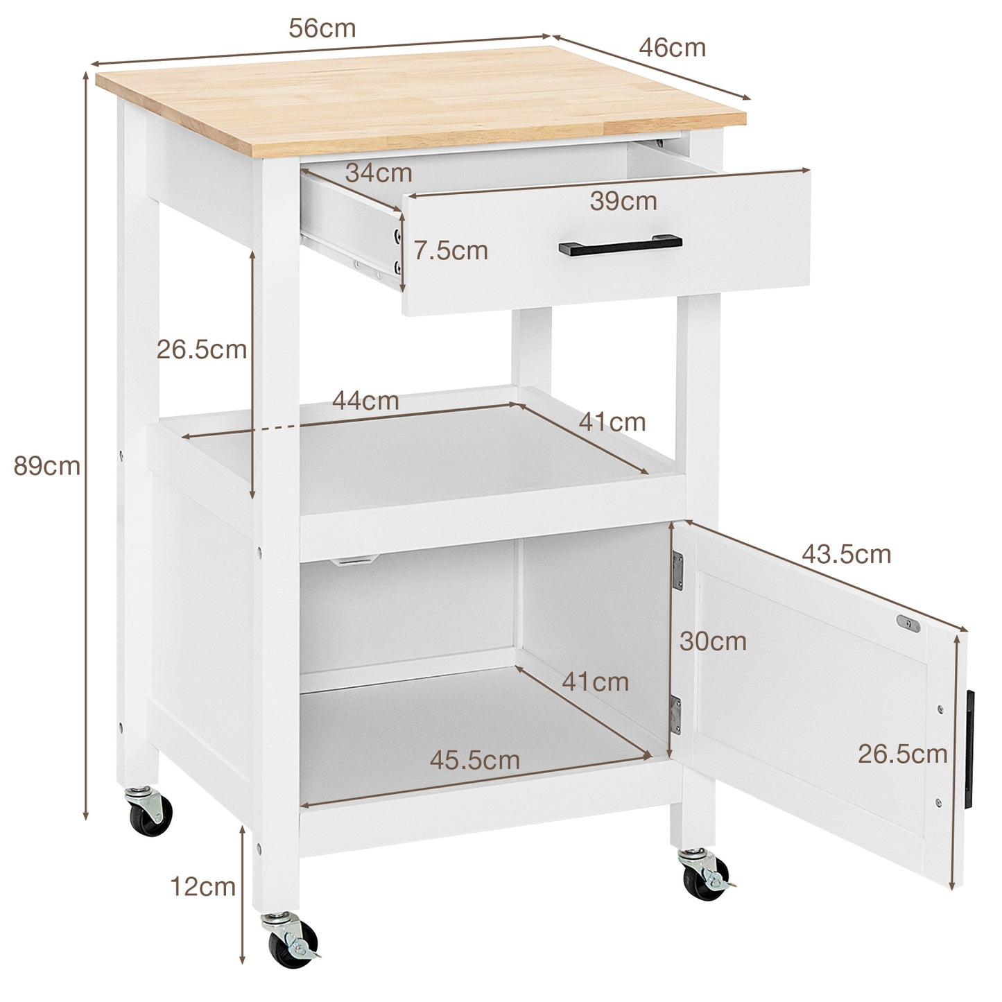 Diversified Storage Areas: The kitchen island cart boasts an upper drawer, a middle open compartment, and a lower large cabinet with a door, giving you the necessary space to arrange your utensils, foods, spices, and extra pots and pans. What's more, there are 3 metal hooks at the side for hanging cups or kitchen towels.