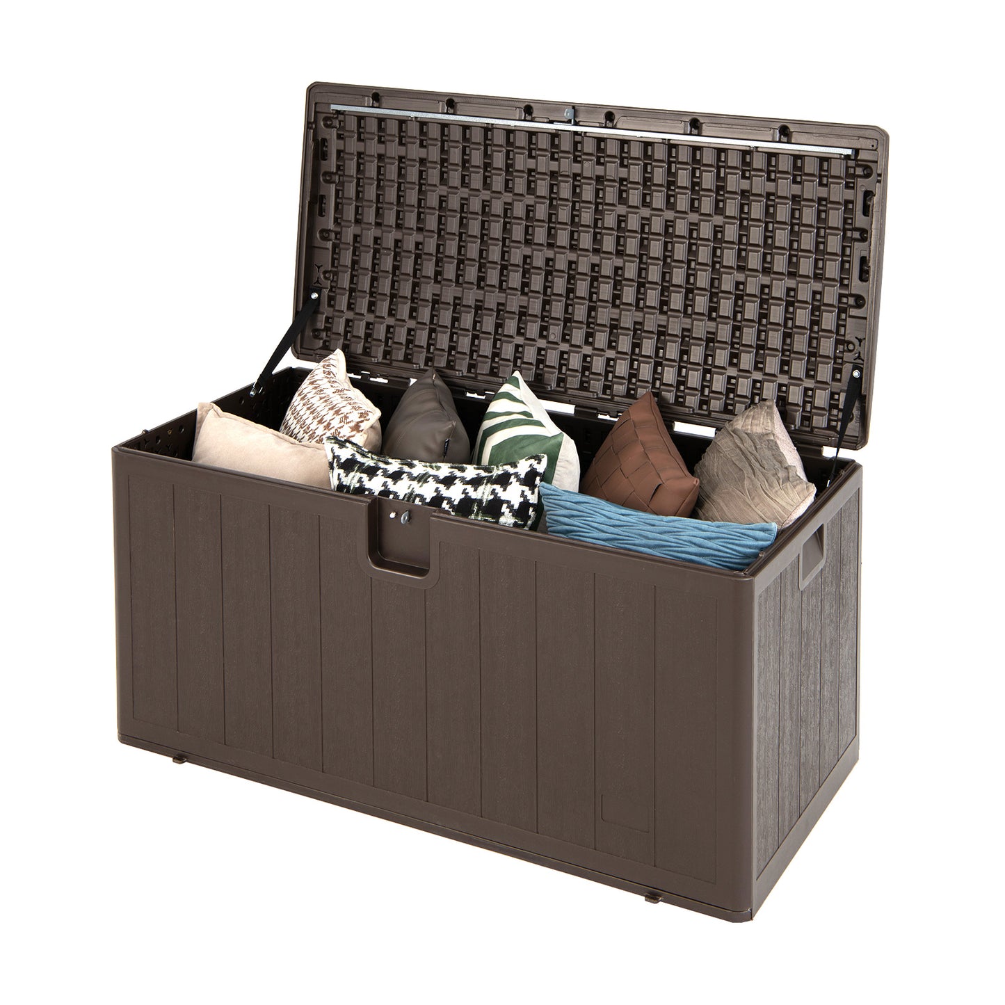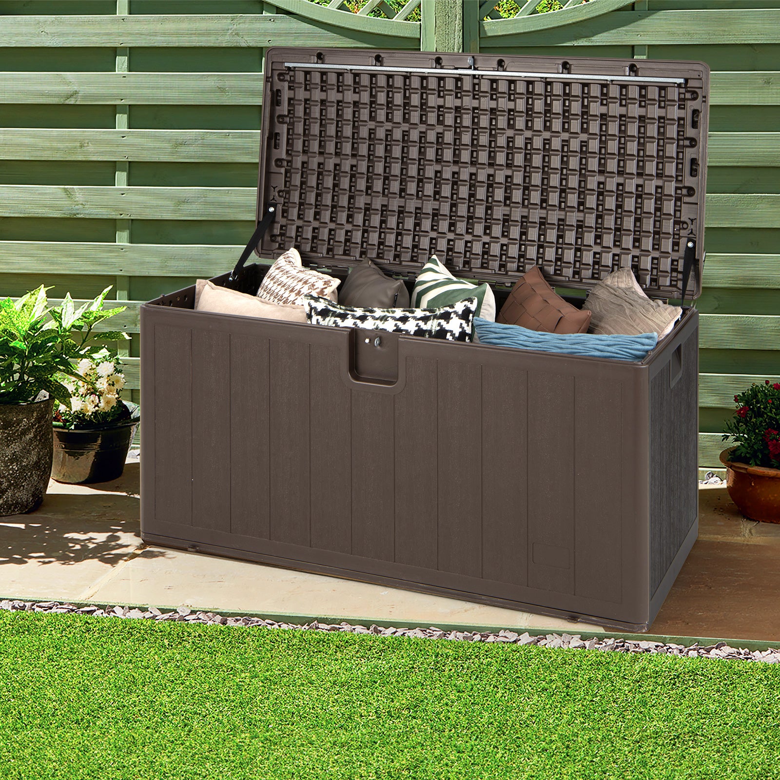 Abundant Storage Space: With an inner size of 123 x 57 x 57cm, the deck box can hold up to 400L, which leaves you no worry about the lack of a place to store cushions, garden tools and pool accessories, etc. What’s more, the enclosed design helps you keep a neat environment and keeps items out of sight.