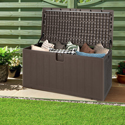 Have you ever been troubled by too many sundries in your home with nowhere to store them? This deck box will help you solve this problem. 400L capacity provides you with ideal storage space to hold daily supplies in a neat and orderly way, including cushions, garden tools and pool accessories, etc. Other than that, the storage container can be served as an extra seating for two kids. The storage box is made of sun-proof resin material to ensure incredible durability and long lasting performance. Considering better using experience, the pre-installed straps allow quick access to the items while side handles make it easier to move from one place to another place. And lockable design highly improves its security.