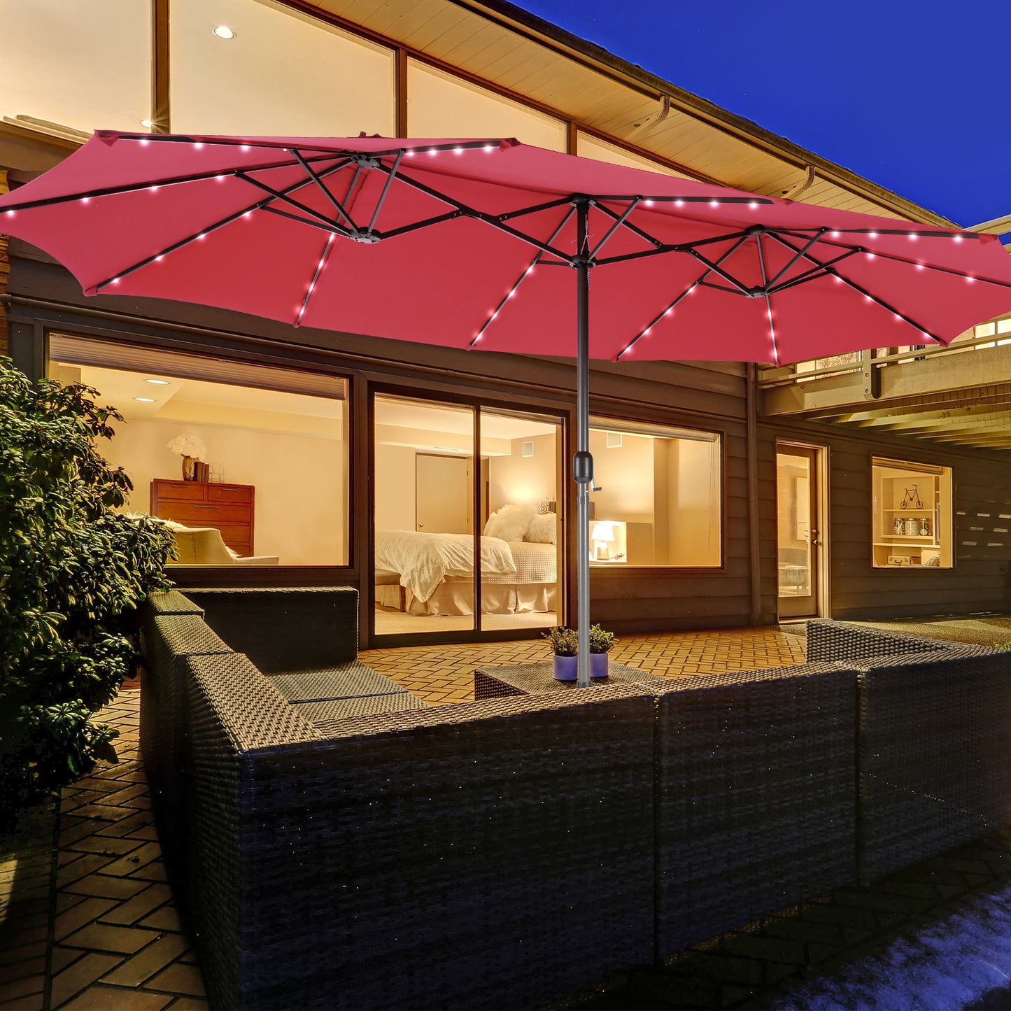 This twin outdoor umbrella offers comfortable shading place for garden, backyard, patio and market. If you have needs to block up the sunlight, this double-sided umbrella will be your ideal choice. Comes with 450cm x 270cm large canopy, this patio umbrella will provide roomy shading space for you to enjoy the coolness. Since the durable polyester fabric, the umbrella will effectively block up the sunlight, and the fabric is fade resistant for long-term outdoor use. What’s more, there are 48 solar LED lights on the ribs to offer brightness and enhance romantic feel during night talk. The hand crank mechanism facilitates umbrella opening and closing, and the widen base with weighted sand bag (sands are not included) increases using stability. With all parts given in the package, the umbrella installation is quick to finish by following the detailed instruction.