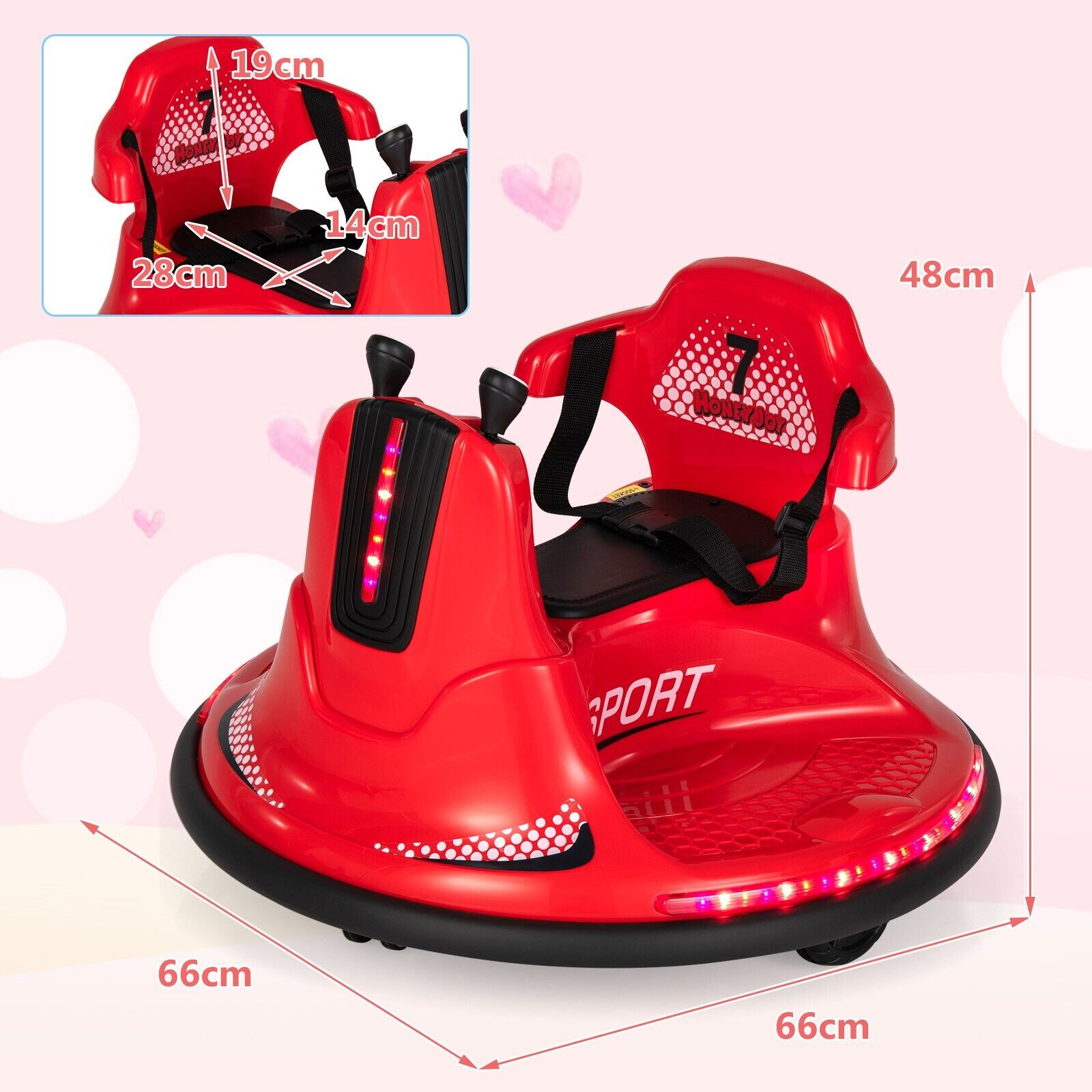 This 6V bumper car is a perfect gift for 37-95 months old kids. With this bumper car, kids can joyfully ride, race, bump or spin. Light-up LED edging, music, horn and story offer kids more fun. Dual joy stickers help kids to manually control the vehicle, while remote control allows parents to stop the car when kids incorrectly operate it. With durable wheels, it can flexibly move or steer in all directions. Besides, this toy car not only ensures hours of joy but also features protective design. It has a speed of 3-6 km/h and a slow start system, keeping it safe to use. What's more, a comfortable backrest with an adjustable safety belt protects kids from rollover. Wide footrest with anti-slip design enables kids to place their feet. What's more, with a soft bumper, it's able to buffer collision. If you are looking for a bumper car like this, do not hesitate to place an order!