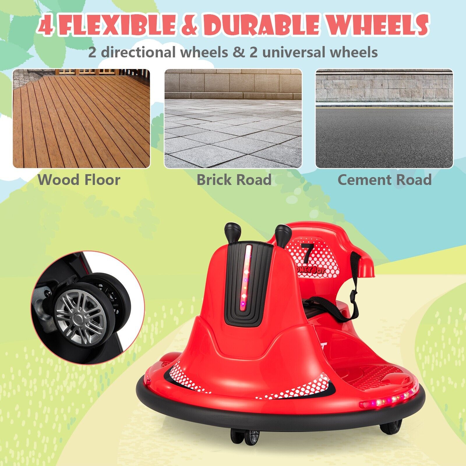 360-Degree Spinning Function: This bumper car is designed with 2 directional wheels and 2 spinning wheels for smooth movement and flexible steering. This ride-on bumper car has a speed of 3-6 km/h and is able to swivel in all directions. Thanks to the durable wheels, you can ride this bumper car on any flat indoor floor, including wood floors and ceramic floors.