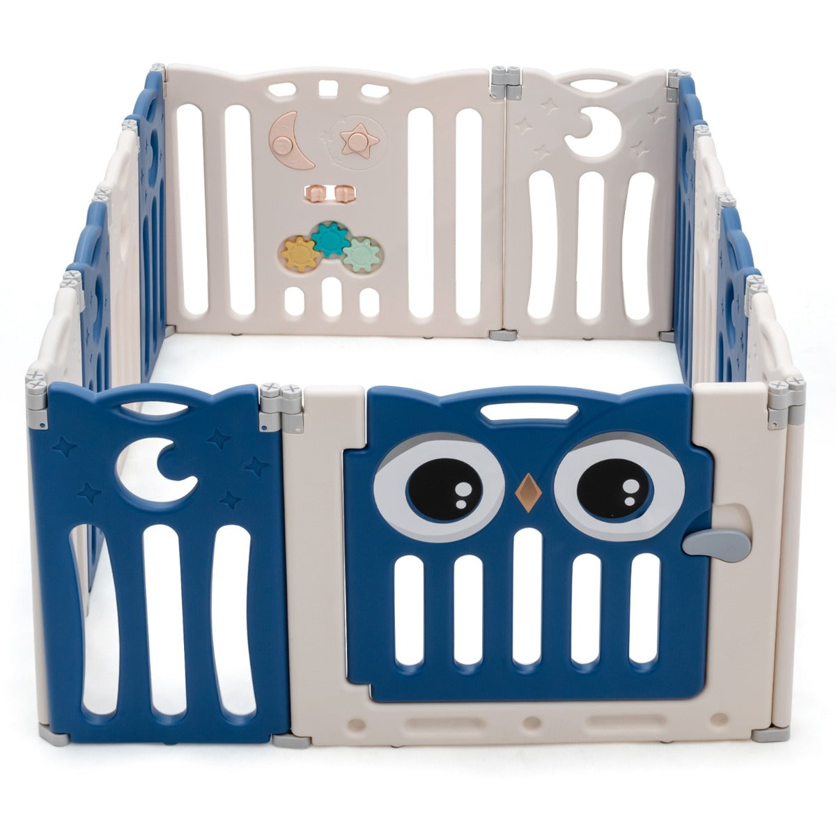 Intelligence and Entertainment Co-exist: The baby fence is not only interesting but also educational, which is very suitable for babies. It includes 2 star and moon shaped buttons, 2 wheels and 3 gear wheels to attract babies' attention. And swivel design can enhance the coordination of your baby's hands.