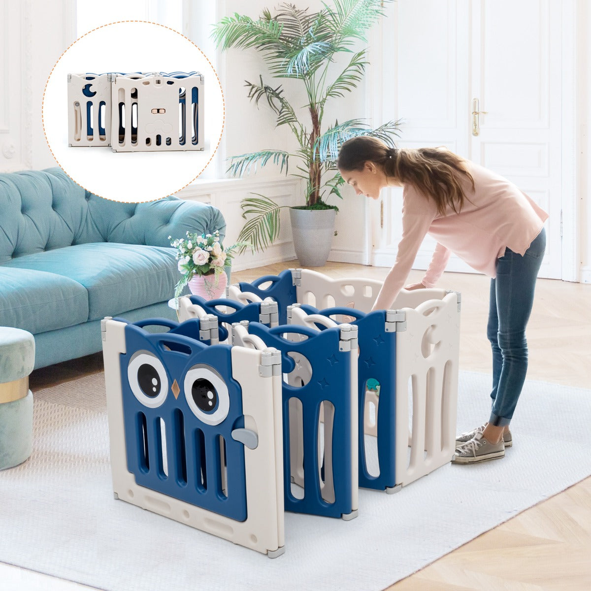 Adjustable Shapes: This baby playpen is composed of 12 pieces of panels, which can be combined to create different play space according to your requirements. By increasing or decreasing the number of panels, you can combine them into square, rectangle or octagon.