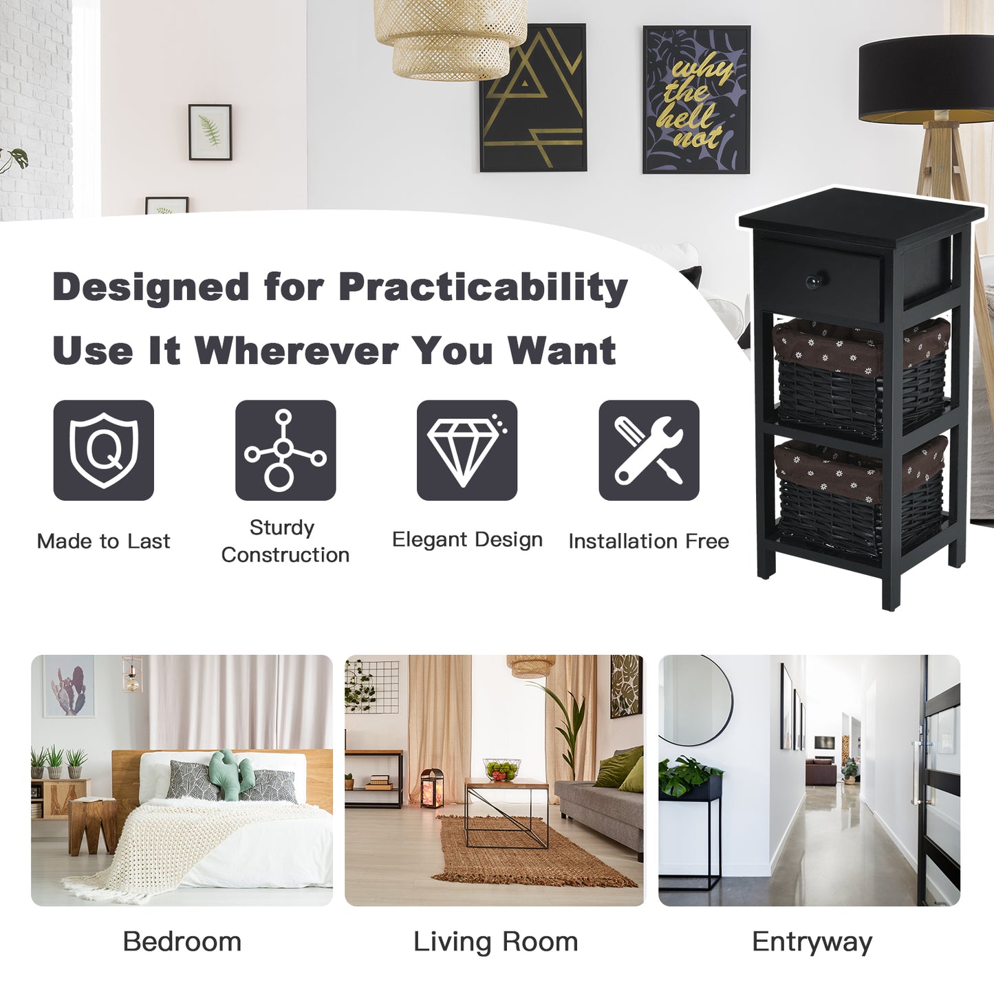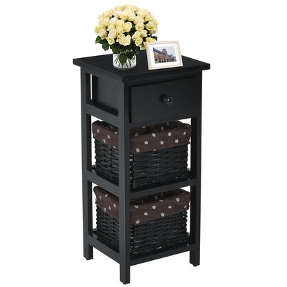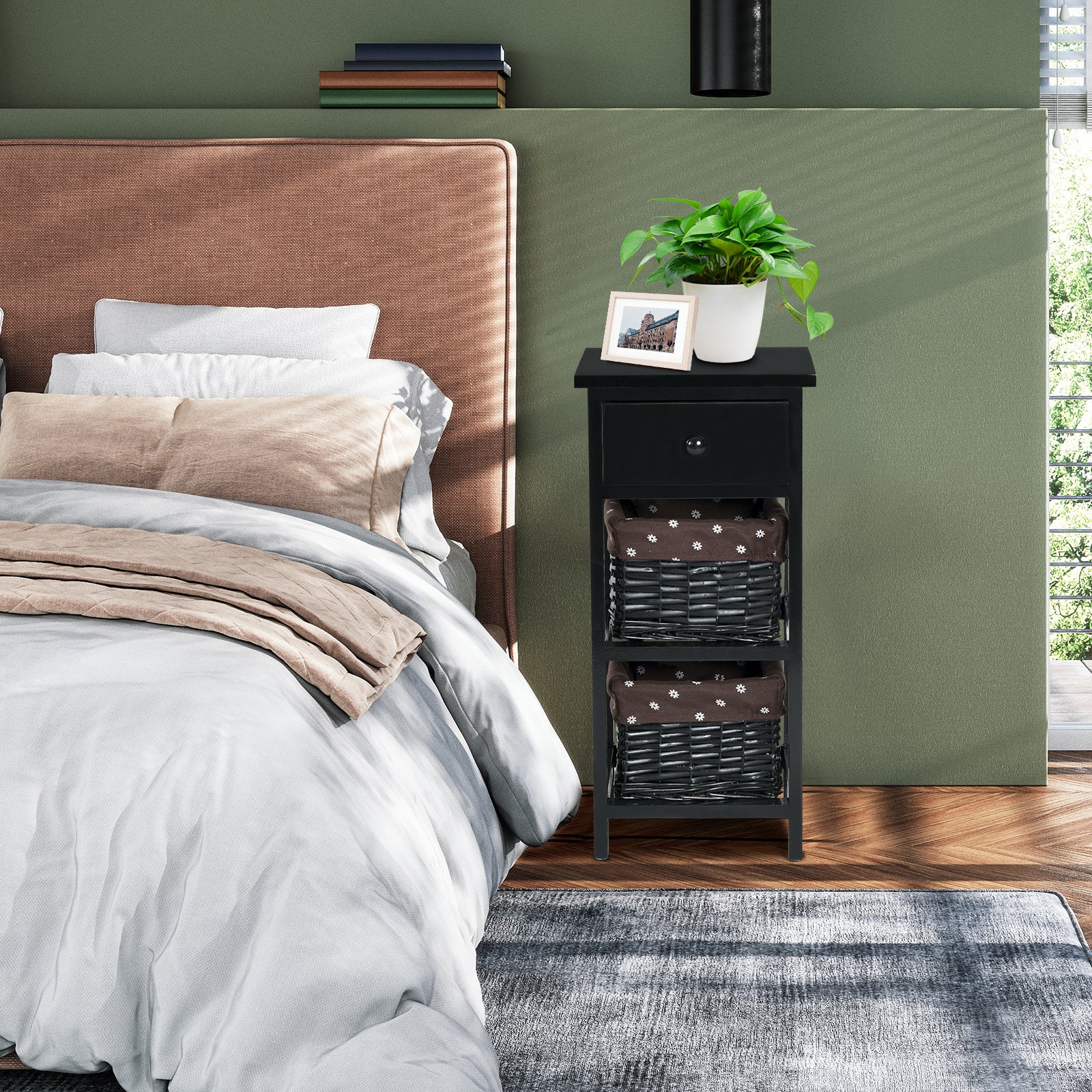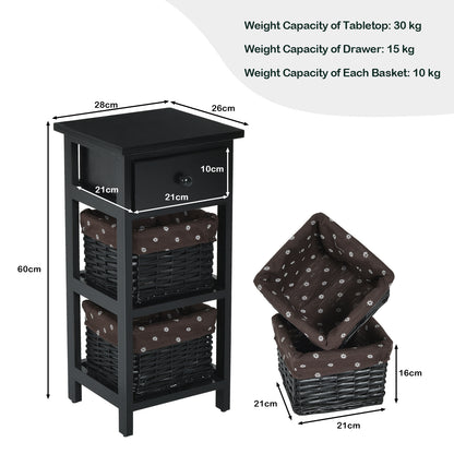 Practical Wooden and Wicker Drawers: The bedside table has 3 fully removable drawers, one of which is made of wood, the other 2 are woven baskets. In addition, the basket drawers are covered with a removable and washable fabric cover.