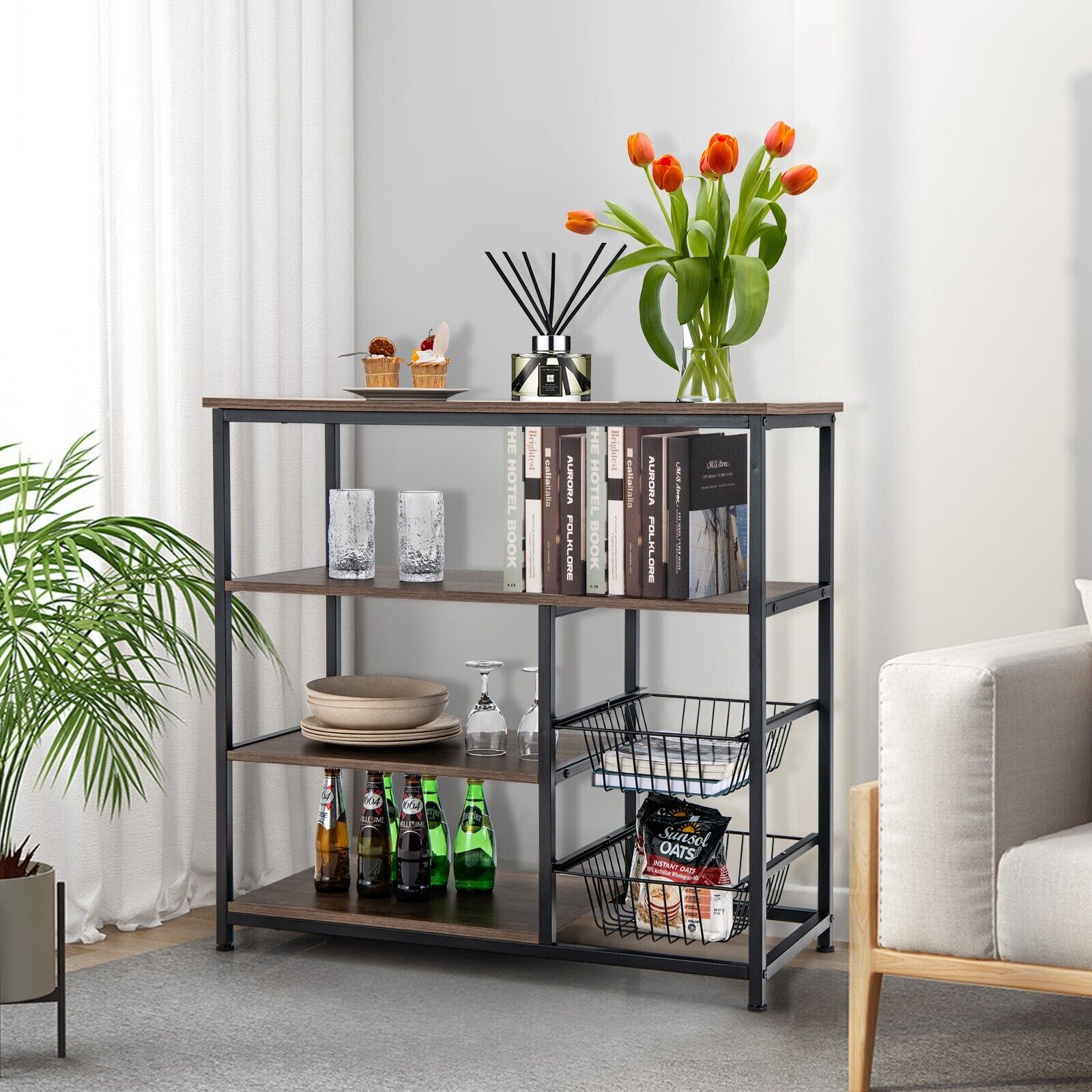 This kitchen baker's rack has a wide countertop, 3-tier open shelves and 2 breathable wire baskets, enabling you to store foods, vegetables, kitchen utensils and more. Apart from kitchen storage shelf, you can also use it as your bookshelf, display rack and record player stand. The top area can hold up to 110 lbs. The upper shelf withstands a weight up to 44 lbs, while the lower shelf bears a weight up to 22 lbs. In addition, with smooth slide rail and fixation device, you can conveniently pull out our baskets without worrying about its falling down. What's more, heavy-duty steel frame and adjustable feet make it strong and stable. And it comes with clear instruction and all necessary accessories for assembly.