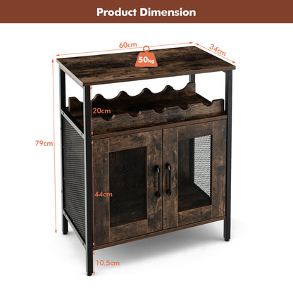 This industrial bar cabinet features various storage spaces to fully meet your requirements. Featuring a tabletop, wine rack, and mesh door cabinet, the sideboard has ample storage space to store ornaments, coffee machine, and dinnerware. Besides, the wine rack holds up to 5 wine bottles and glass holders store up to 6 wine glasses. You can remove the wine rack and glass holders for more storage. The 2-in-1 design meets your different needs. Made of firm and durable material, the wine bar can be used for a long time. The metal legs with adjustable foot pads enhance stability and keep balance. Moreover, the anti-toppling kit will keep the coffee cabinet stable and protect your safety. With exquisite workmanship and industrial style, the freestanding sideboard adds fashion and classic beauty to your home. This floor liquor cabinet can not only serve as a wine bar/coffee cabinet in the living room but also as a storage sideboard for the dining room or kitchen. If you are looking for a bar cabinet like this, do not hesitate to place an order!