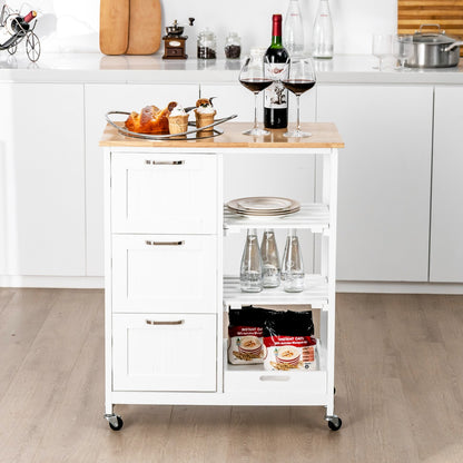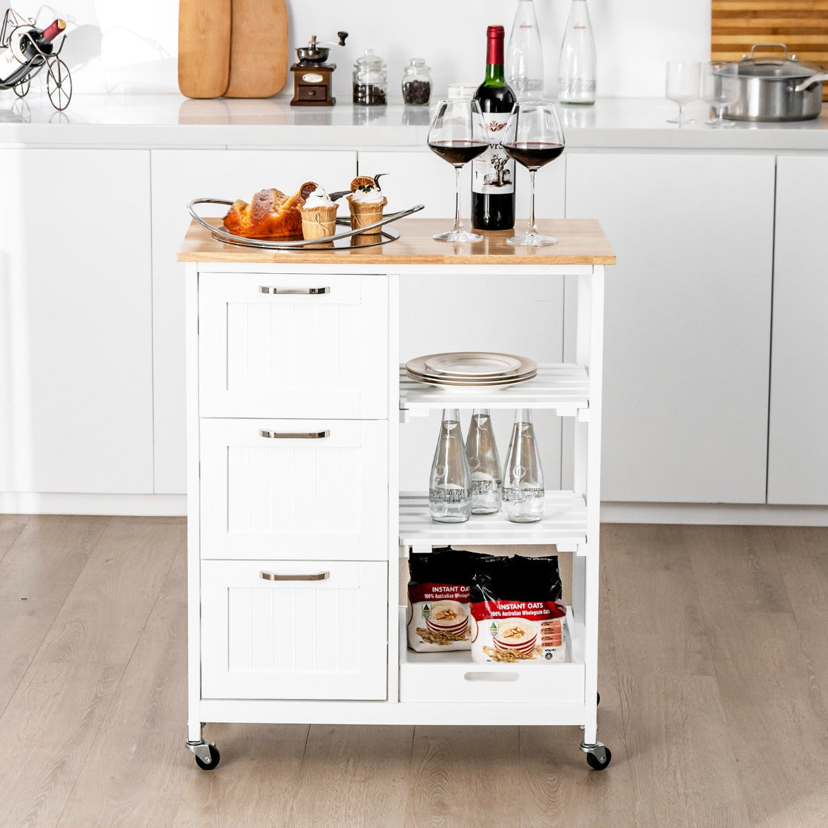 This kitchen cart is a piece of furniture combining practicability and beauty, which is suitable for various occasions. The wide countertop supports foods, the 3 deep drawers contain small daily items, and the 3 open shelves store seasoning, wines, glasses or towels. If you need to move it to other places, the universal wheels will help, which is superior to the previous plastic design either in sturdiness or durability. Moreover, 2 lockable casters ensure stability when you stop the cart. After using it, you can easily wipe the stains away owing to the smooth surface. Furthermore, the natural material used makes this cart have a strong weight capacity and services for a long time. If you are looking for such a product, don't hesitate to place an order!