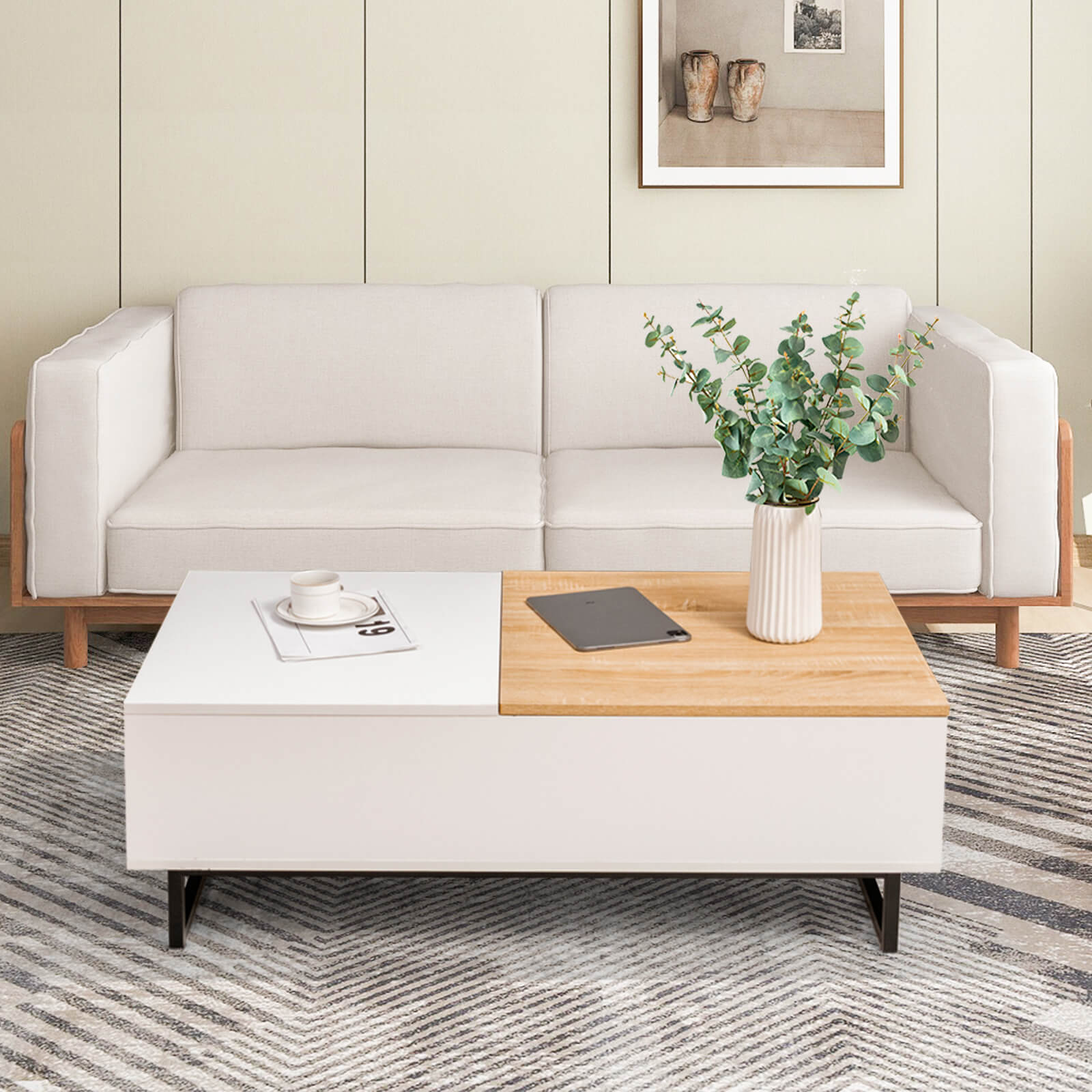 Hydraulic Elevating Top: Half of the coffee tabletop can be lifted up with the support of built-in hydraulic lifting mechanism. Compared with outdated spring mechanism, this structure provides you with smooth, noiseless and stable lifting experience. You can work or eat comfortably on the tabletop without worrying about wobbling.
