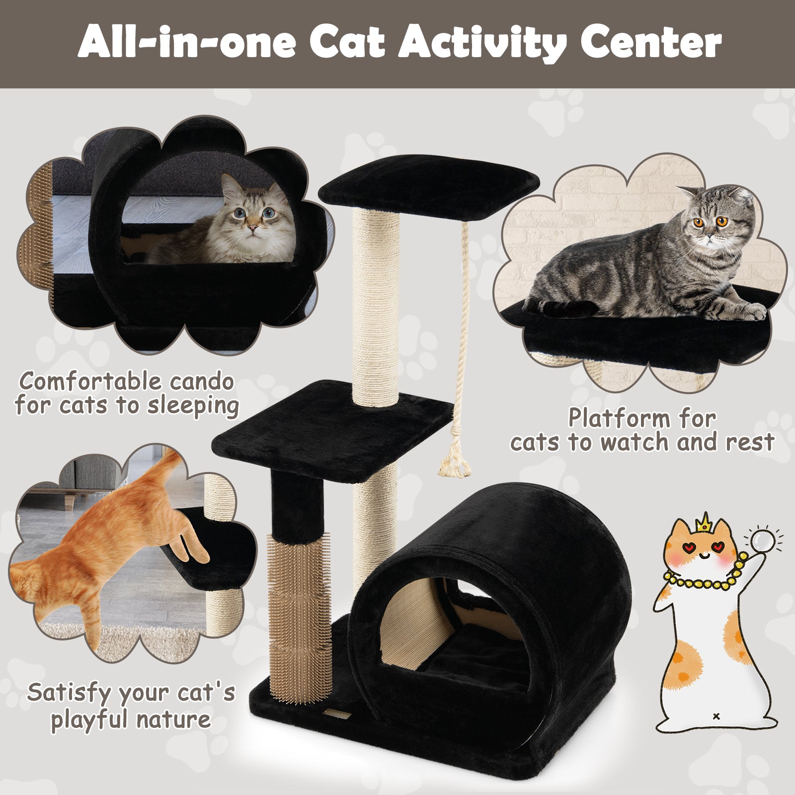 Multi-level Kitty Condo Climbing Tower with Groom Brush and Sisal Rope-Black