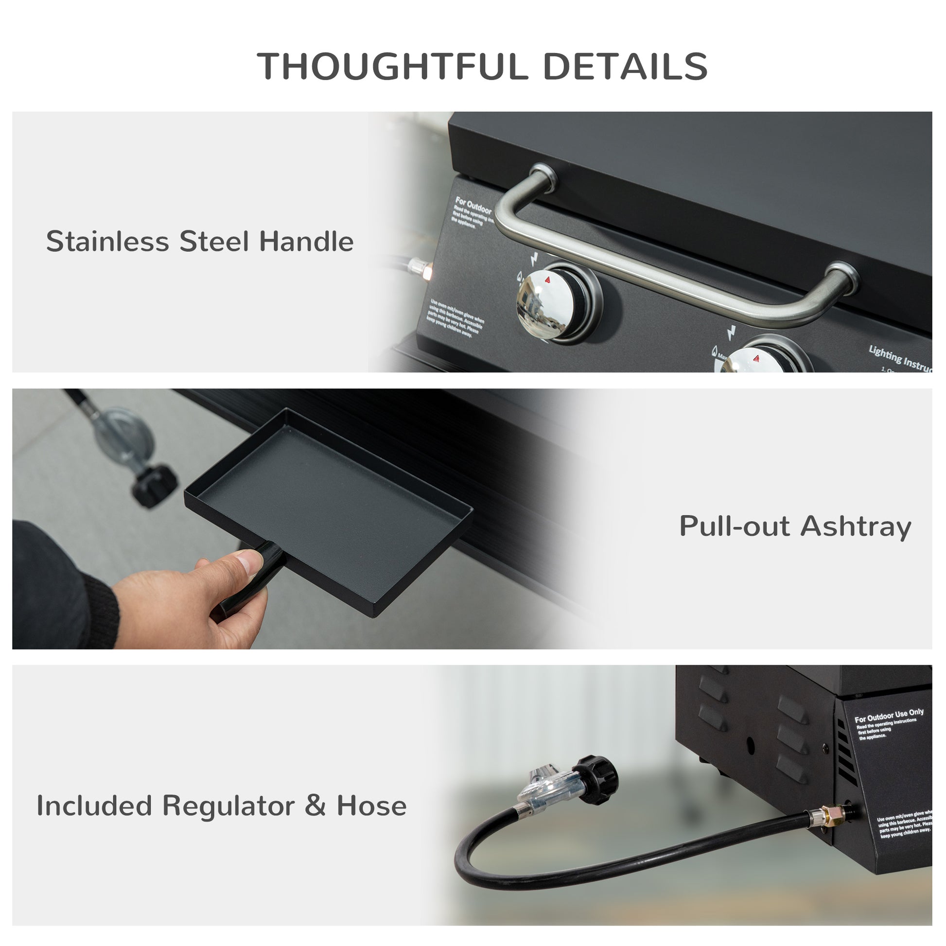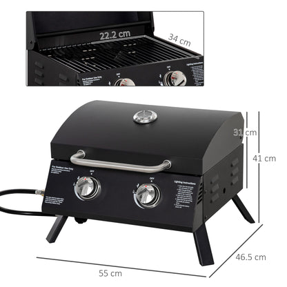 Outsunny 2 Burner Gas Barbecue Grill Garden Portable Tabletop BBQ with Folding Legs, Lid, Thermometer, Carbon Steel Body, Black