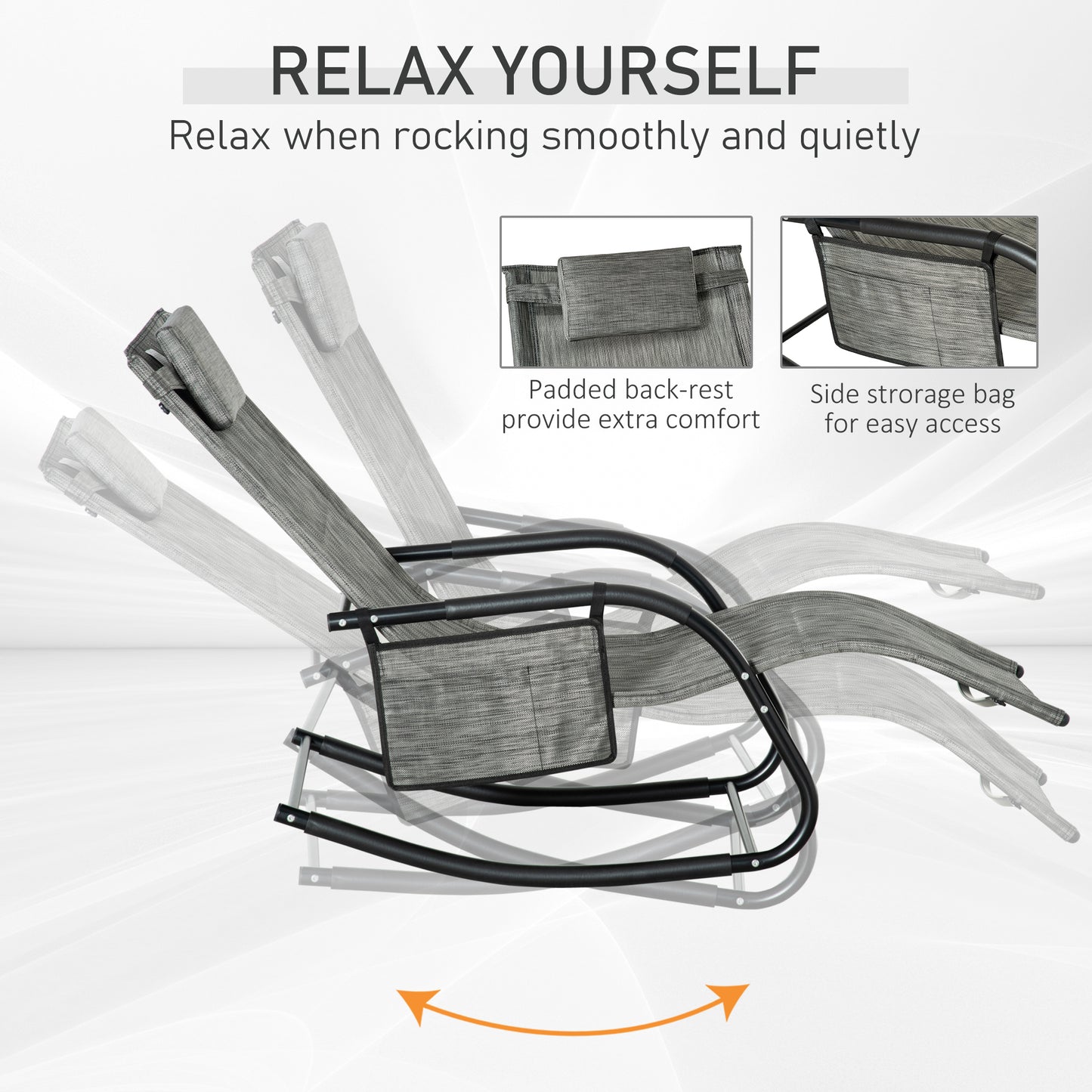 Outsunny 2PCs Outdoor Garden Rocking Chair, Patio Sun Lounger Rocker Chair with Breathable Mesh Fabric, Removable Headrest Pillow, Armrest, Side Storage Bag, Dark Grey