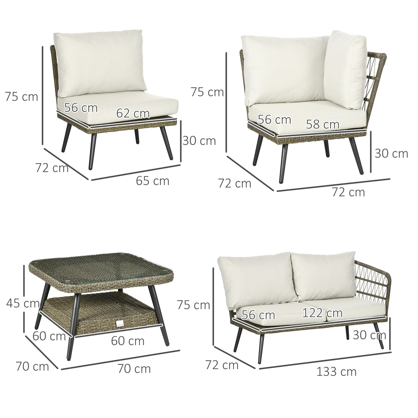 The Outsunny 6-Seater Rattan Corner Sofa includes a double sofa 133W x 72D x 75H cm, corner sofa 72W x 72D x 75H cm, middle sofa 65W x 72D x 75H cm, and a coffee table 65L x 72W x 75H cm.