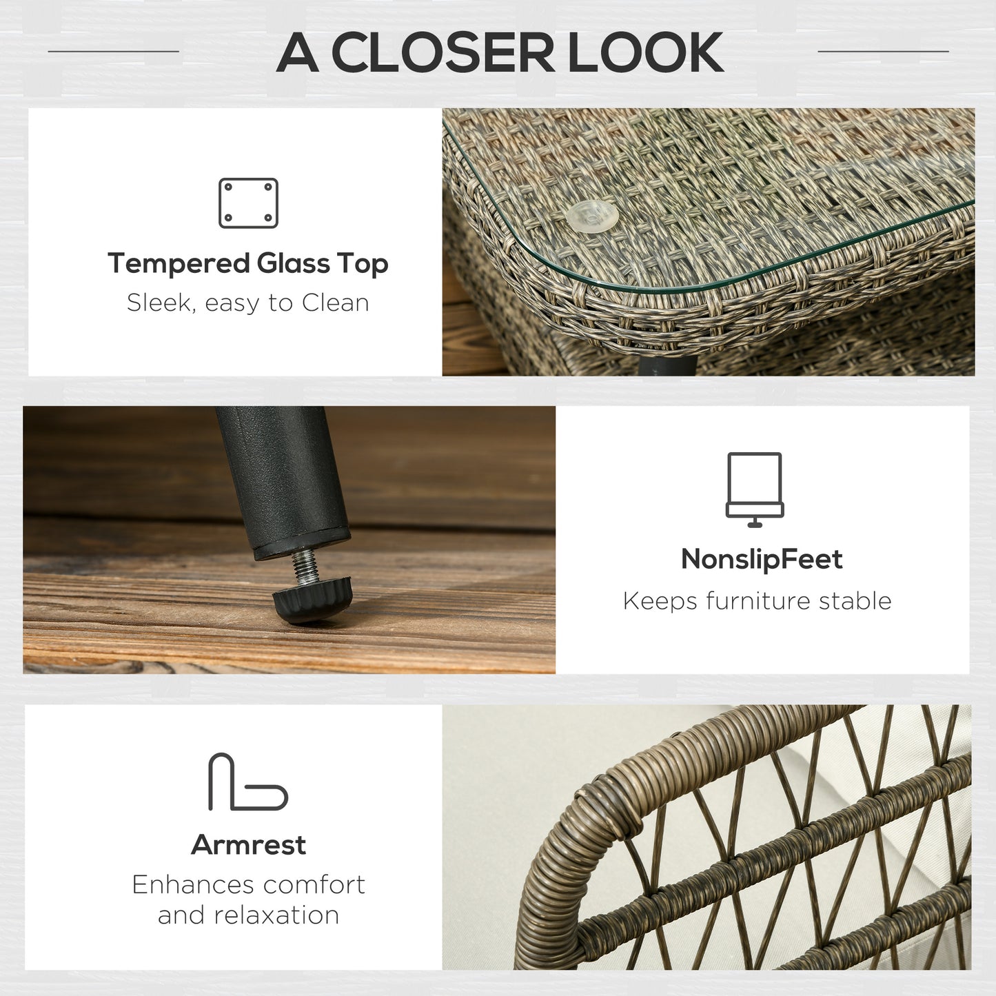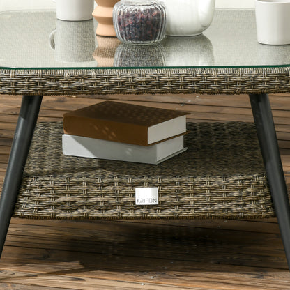 The Outsunny Rattan Garden Furniture set includes a coffee table with a sleek tempered glass top and a two-tier design for extra storage space.