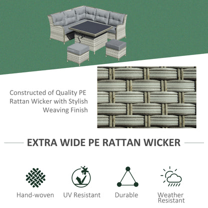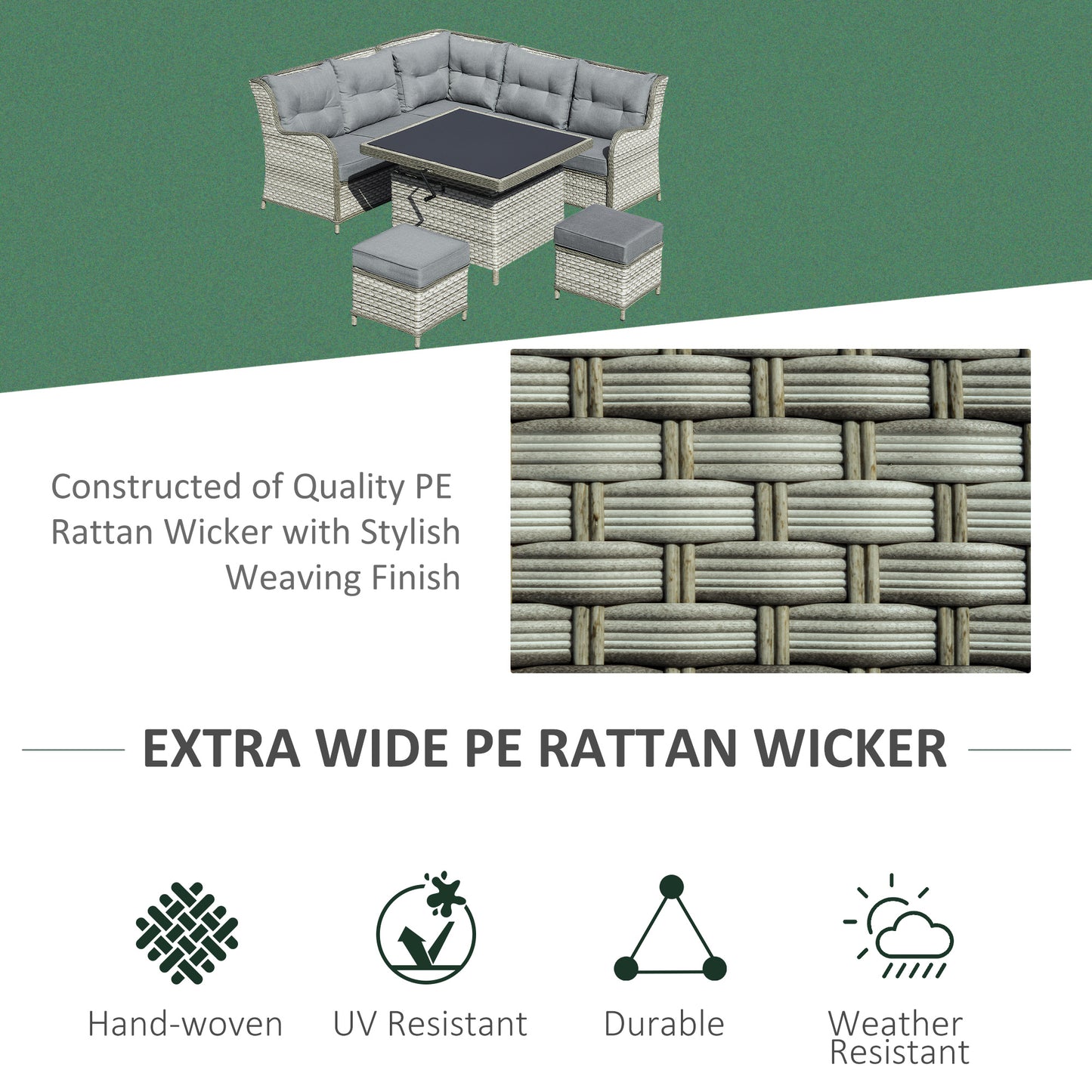 Outsunny 7-Seater Patio PE Rattan Corner Sofa with Adjustable Convertible Rising Table, Wicker Sectional Conversation Furniture with Cushions, Grey