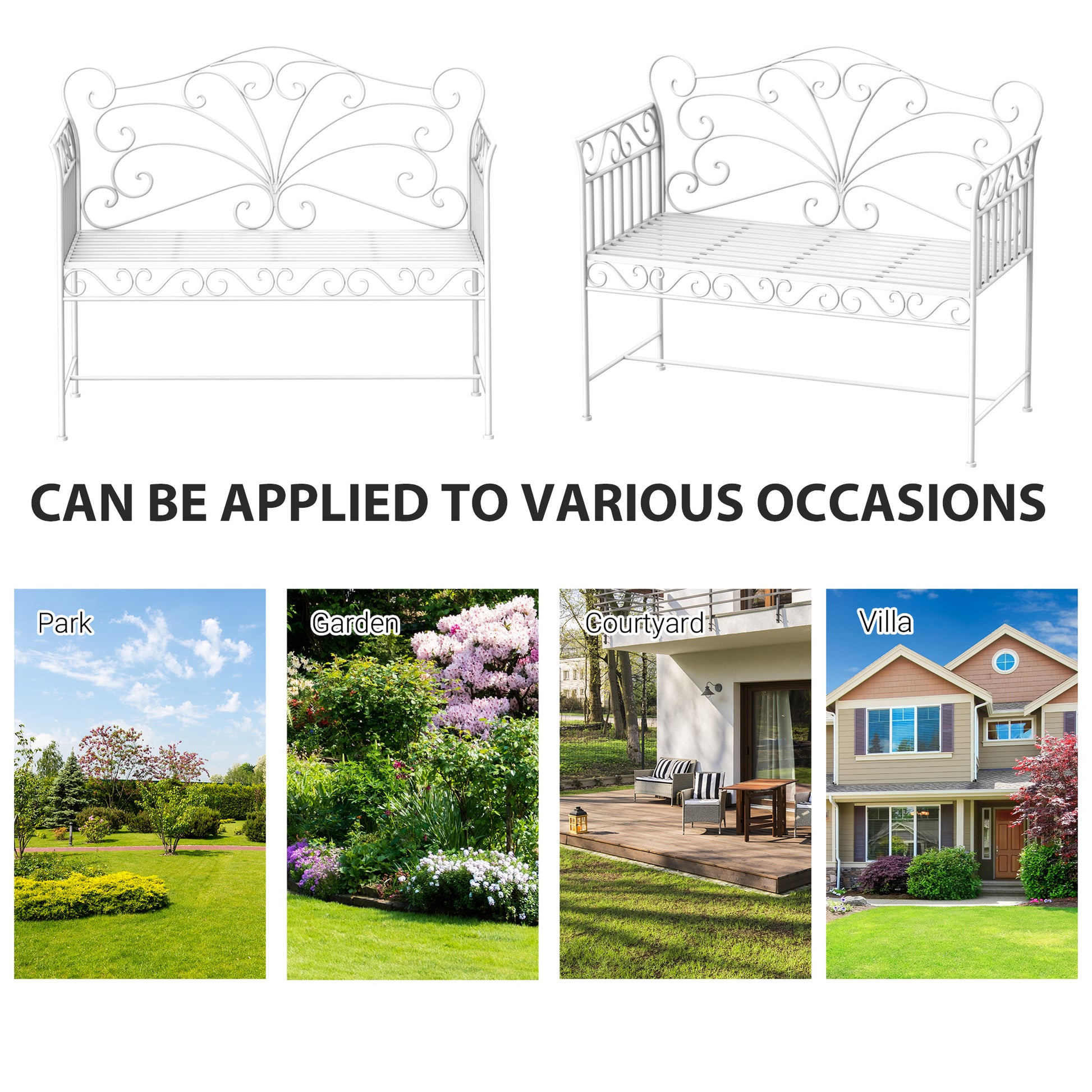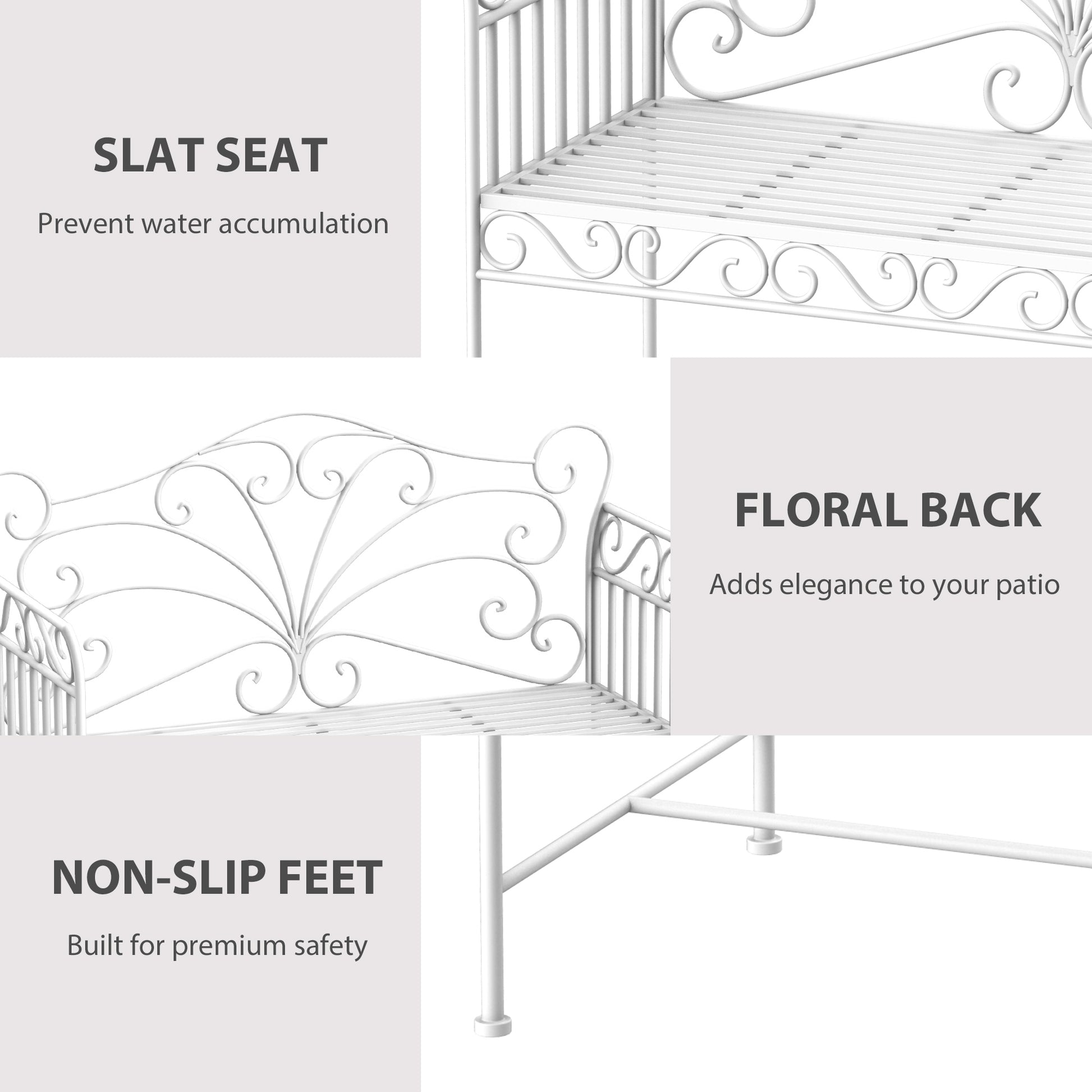 This Product Is Ideal For You If You Want... a stylish and durable white metal garden bench that enhances any outdoor space. Its elegant floral design adds charm to gardens, parks, or cafes, while the sturdy, weather-resistant construction ensures long-lasting use. Non-slip feet keep the outdoor bench secure, and the fresh white finish stays vibrant against the elements. Perfect for relaxing outdoors year-round.