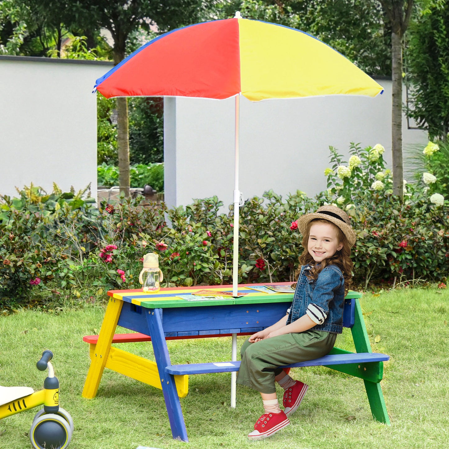 Outsunny Kids Picnic Table Set Wooden Bench Rainbow with Sandbox Removable & Height Adjustable Parasol Outdoor Garden Patio Backyard Beach