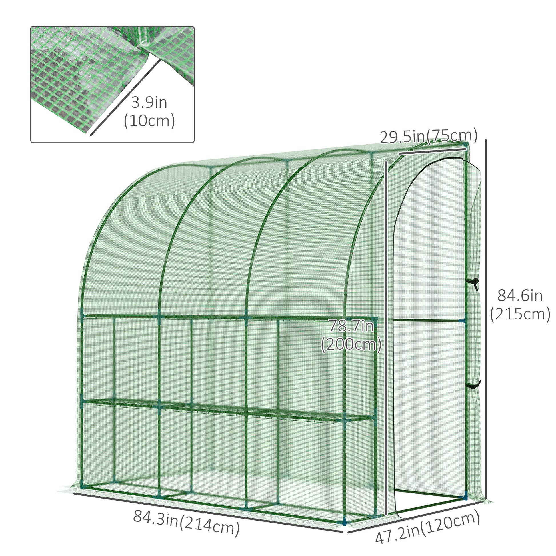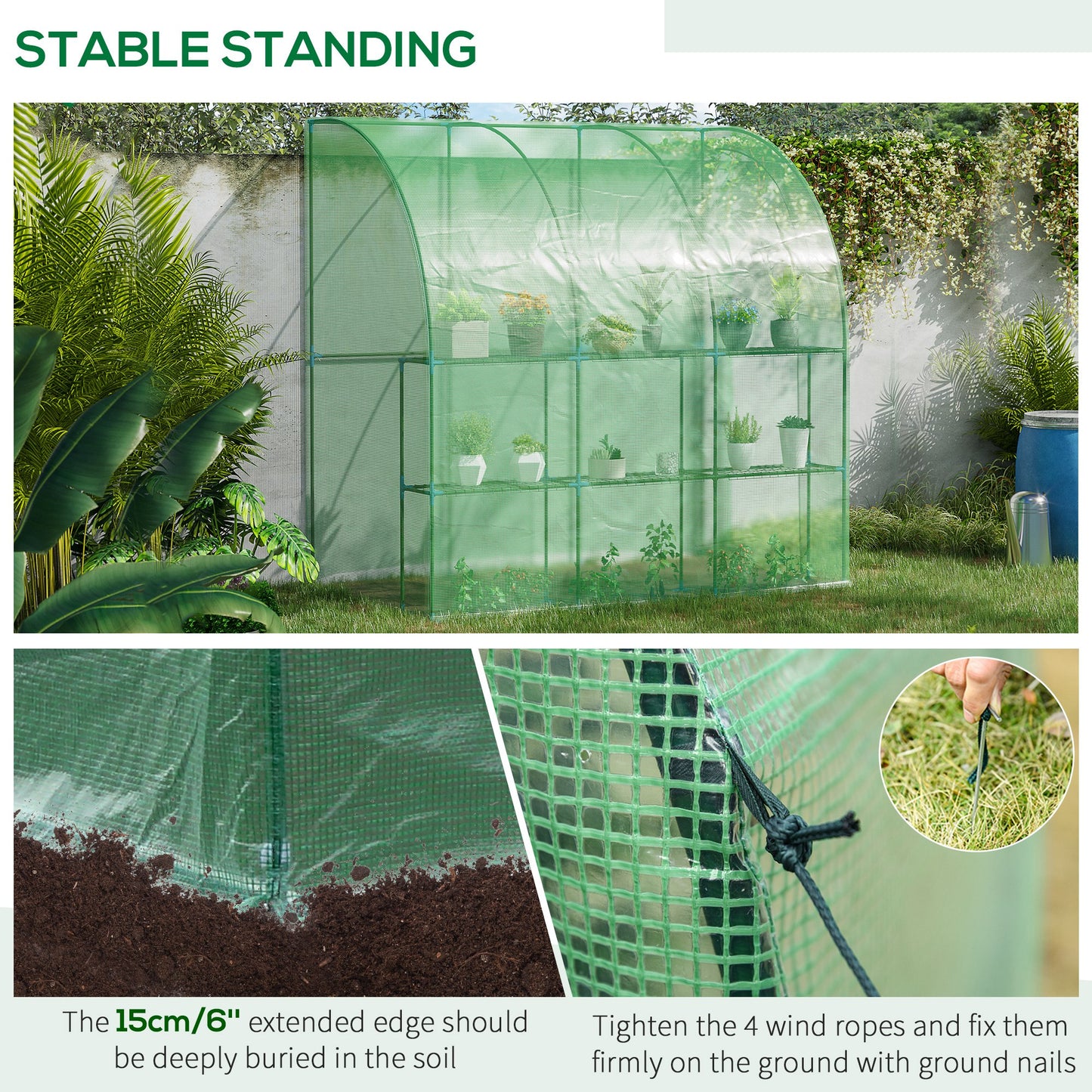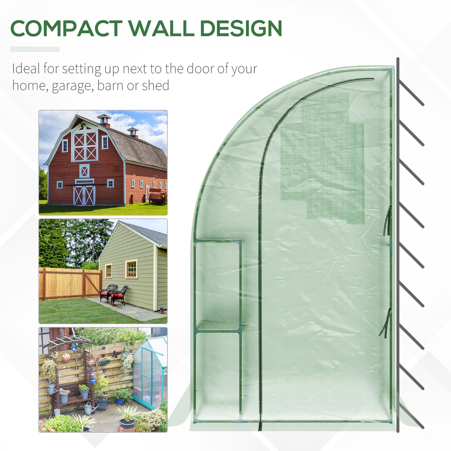 Outsunny Outdoor Walk-In Lean to Wall Tunnel Greenhouse with Zippered Roll Up Door PE Cover Green 214L x 120W x 215Hcm
