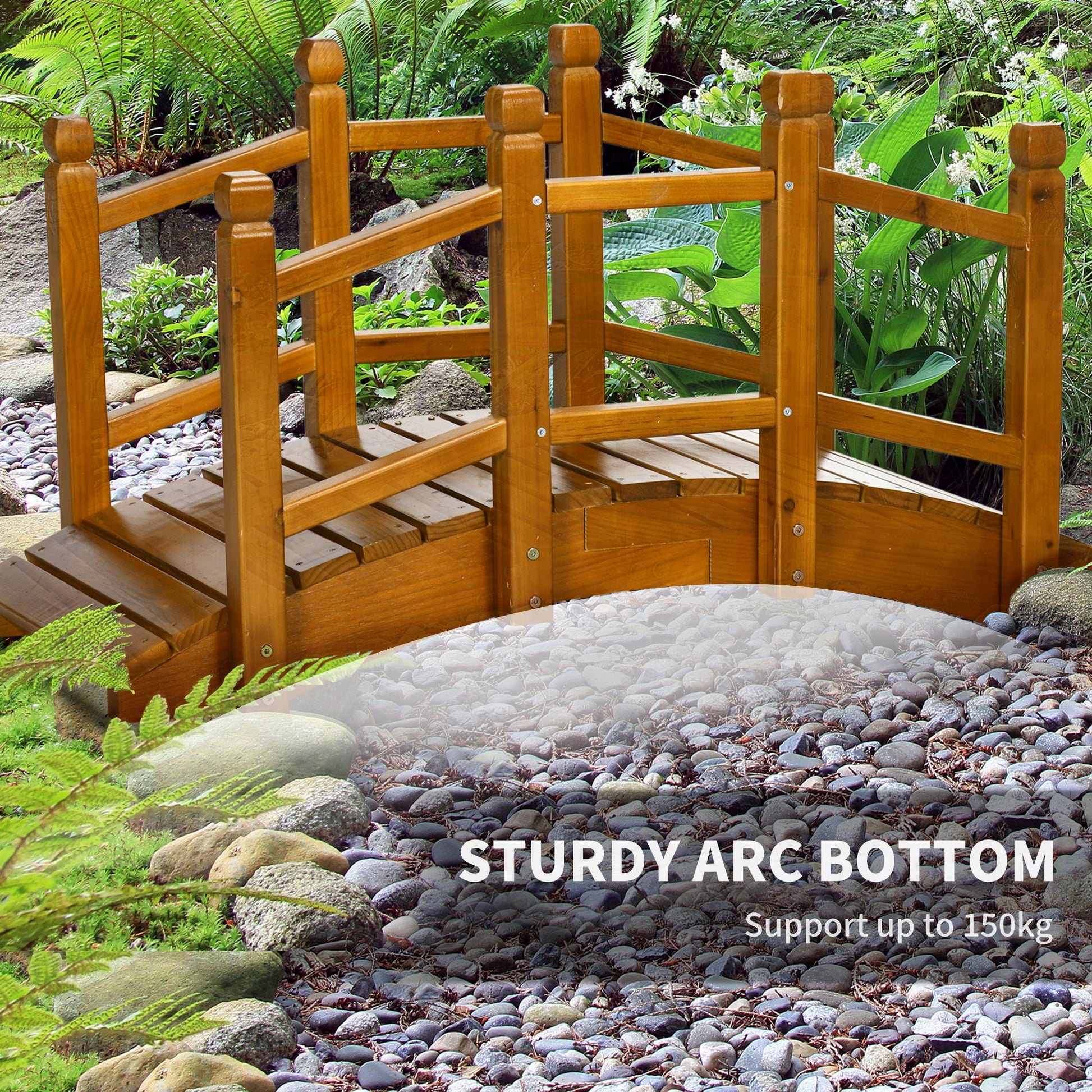 Transform your garden with the elegant Outsunny wooden garden bridge. Create a peaceful oasis and add a touch of charm to your outdoor space. Enjoy the beauty of nature with this exquisite small pond bridge. Order now and experience the tranquility it brings.