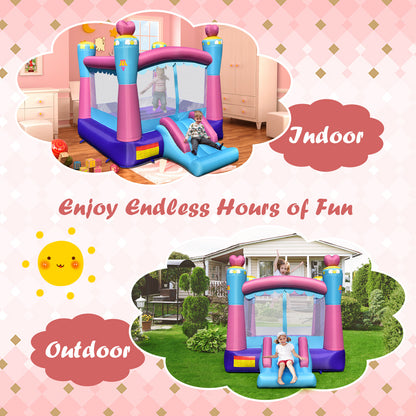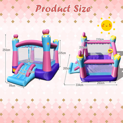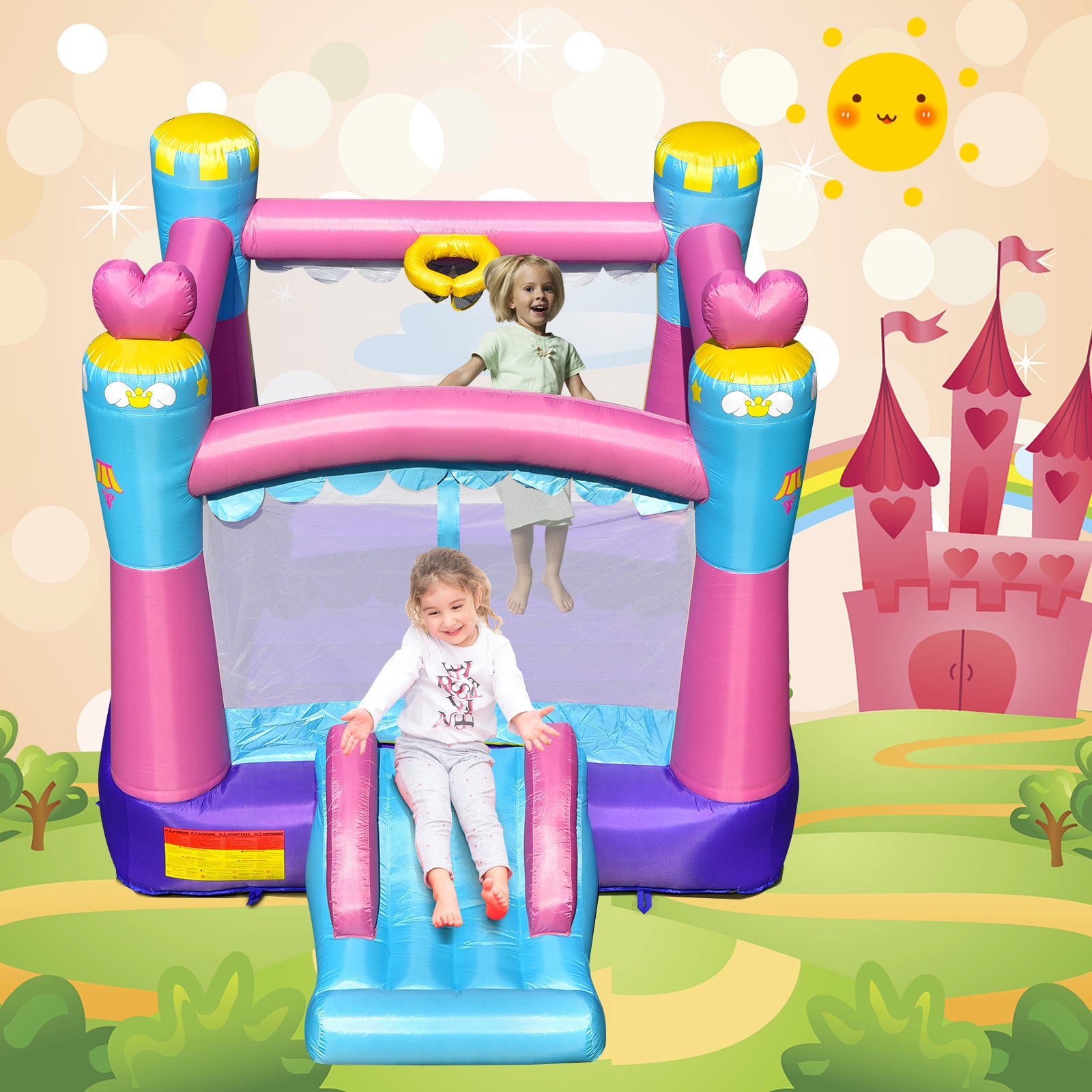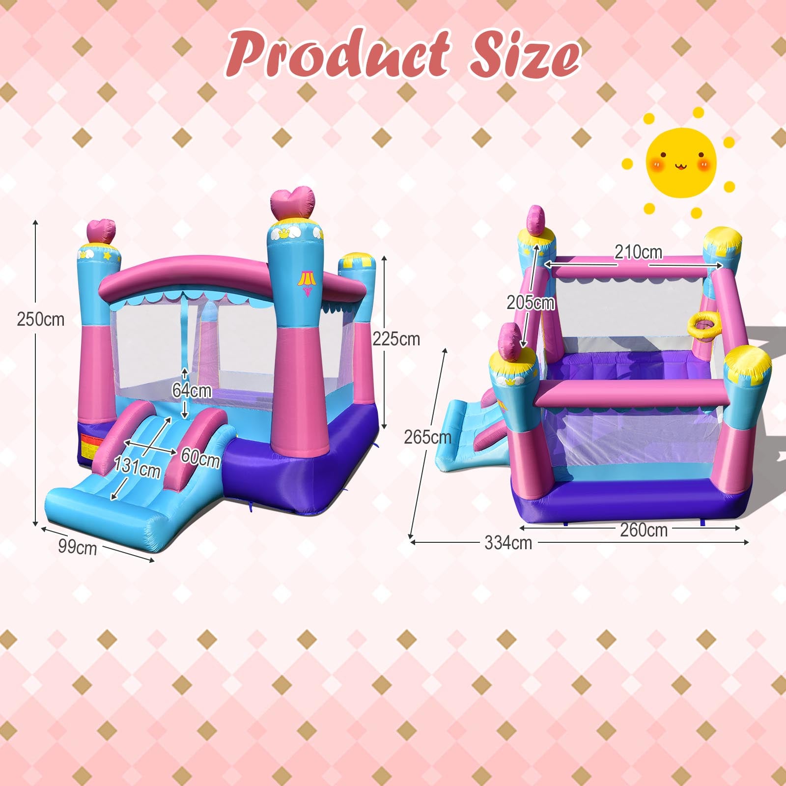Diverse Designs for More Pleasures: Except for the lovely princess-themed design, the bouncer also allows kids to experience different kinds of fun. With a spacious middle mat, kids can freely jump and use the basketball rim. Through the entrance with hook and loop fastener, there is a slide with a buffer to offer exciting sliding.