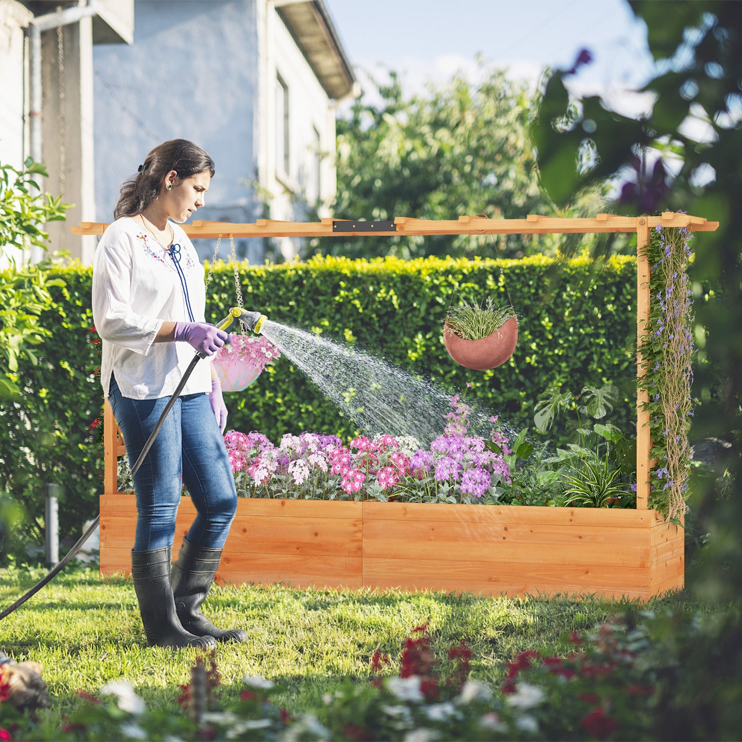 Discover the ultimate garden bed with a trellis, designed to elevate your gardening experience. Its versatile raised design includes a hanging roof, providing ample growing space for basket plants. The planter box is ingeniously divided, featuring 2 trellises that maximize gardening space. Crafted from solid fir wood, this frame is sturdy, durable and safe. With its all-weather painting, it applies to different outdoor occasions. The advanced drainage system, complete with drainage holes and bottom gaps, eliminates the worry of overwatering. Setting up this garden bed with trellis is a breeze with the provided clear instructions and hardware.