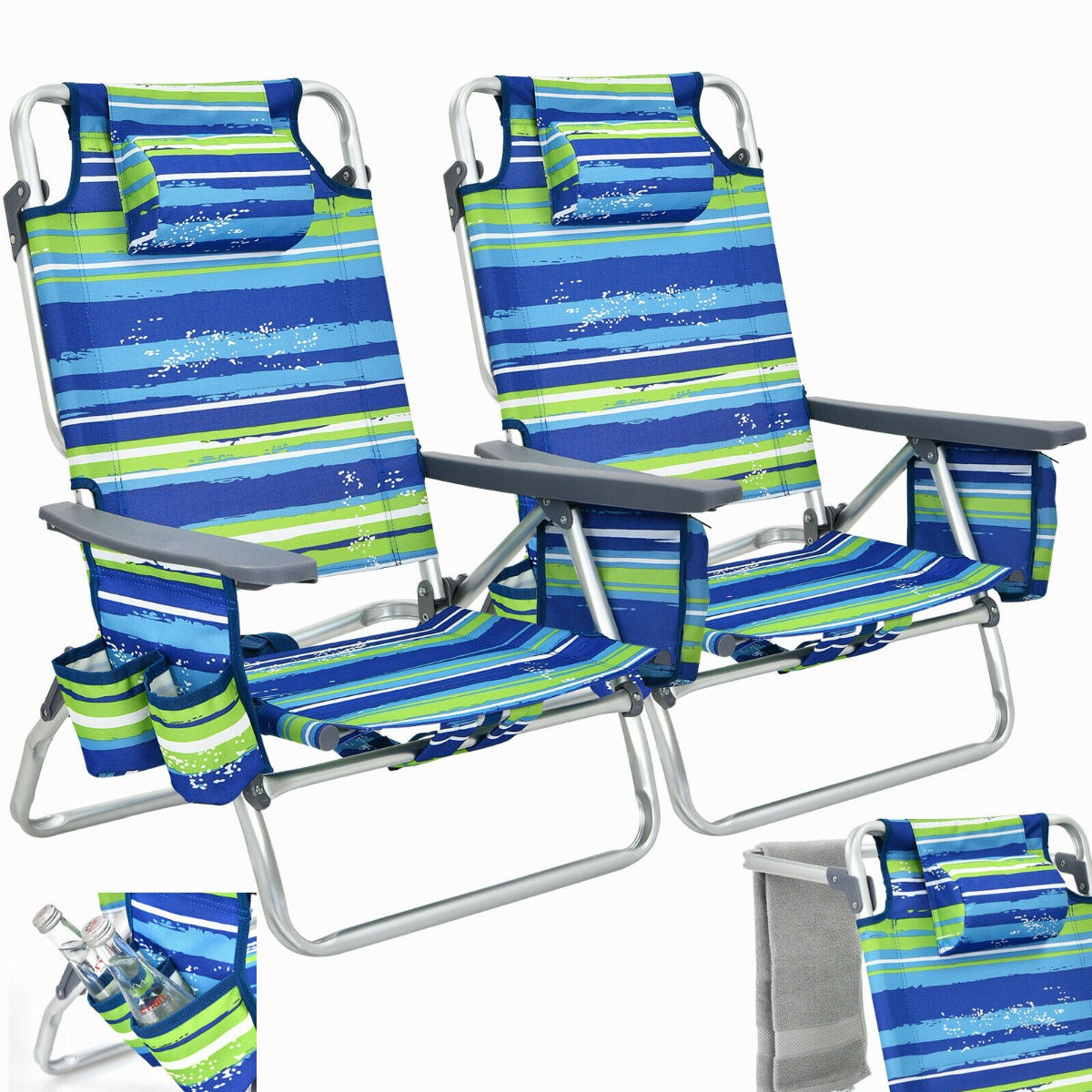 Set of 2 Folding Beach Chair Set with Headrest and Cup Holder-Blue & Green