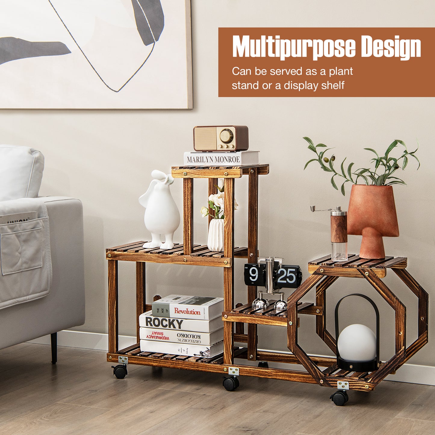 wooden plant stand features 6/6/8 open shelves for displaying beautiful flower pots. And the high-low structure offers enough space for plant growth and ensures full sunlight benefiting all plants. More than that, the display shelf can also be used to show your favorite ornaments, photo frames, books, collections, and more, adding highlights to your home. The flower shelf is made of 100% natural pine wood and has been carbonized at a high temperature, ensuring good sturdiness and long-lasting durability. Besides, there exist detachable and 360° swiveling wheels, allowing for easy movement, and you can also easily detach them when not in use. With its exquisite wood grains, the farmhouse plant stand can be a perfect decoration for any indoor and outdoor area!